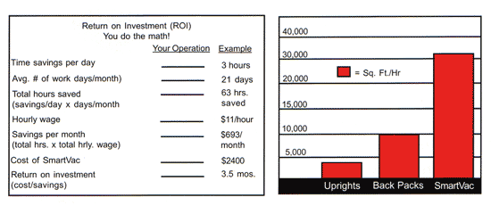 With a full charge, the SmartVac can clean for up to 2.5 hours on a relatively friction free floor (like concrete). Something like carpeting produces more drag and will cut down on that full charge cleaning time. You should still expect to get about 1.5 to 2 hours on a full charge though. Maximum cleaning productivity is rated at 38,000 square feet per hour, so on a full charge, you should be able to easily sweep a 75,000 square foot facility.